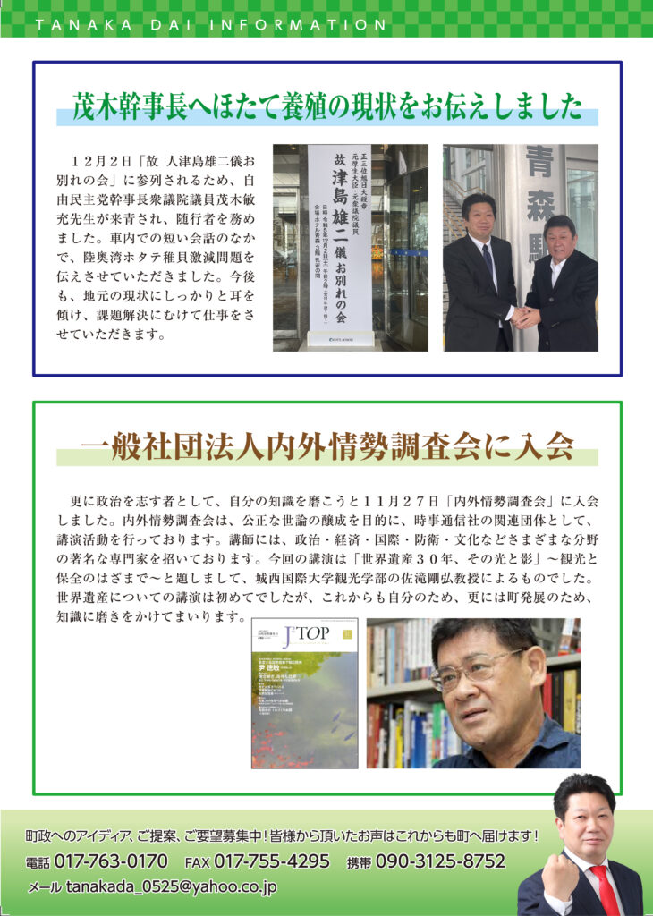 田中だい通信12月25日号 投稿者: kaz2023年12月25日2023年12月25日田中だい通信 田中大は元気にしております。ご心配をしてくださった方々本当にありがとうございます。田中大はもう一度立ち上がります! 支援者にお送りしております”田中だい通信”お送りしますこちらは今回田中大が町議会議員として最後に発行するものです是非この機会にバックナンバーも含めてご覧いただけたらと思います画像に変換されたものですので、もし見えにくい方はコチラからPDF版をダウンロードされた方がいいかもしれません 容量は大きくなりますが、PDF版を推奨します 田中大通信P1 田中大通信P2 関連